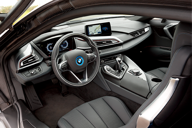 そんなエクステリアのデザインに対して、インテリアも決して負けてはいない。実はi8の場合、システムの起動やドライブモードの選択、さらにはライトやワイパー類の操作系は、意外にもすでに量販されている普通のBMW車と同様のデザイン。それでいながら、いかにも未来的なエクステリアに勝るとも劣らない先進性を演じているのだから、やはりそのデザイン手腕はたいしたものだ。