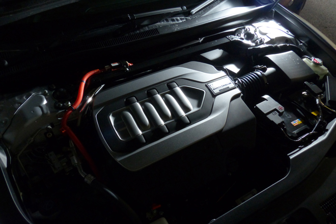 V6エンジン+3モーターのシステム最高出力は382ps。車重は2t近い。ボンネットやドア・パネル等にアルミを用いているとはいえ、絶対的にはそうとう重い。それが軽々と加速する。エレキの力はグレートである。
