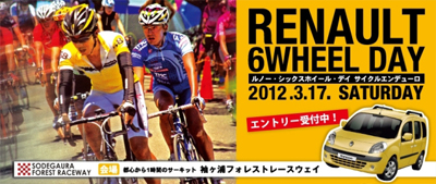 ルノー・ジャポン特別協賛として3月17日に、袖ヶ浦フォレスト・レースウェイで「サイクルエンデューロ」を中心としたイベント、ルノー6 Wheel Day が開催されるが、このイベントに先立ち「6 Wheel “車載”フォトコンテスト」を開催中だ。これは、お気に入りのクルマにお気に入りの自転車を積んだ写真を投稿してもらい、コンテストを実施するというもの。4輪の車種はルノーでなくてもよいという。メットシンセシスのヘルメットや、ルノーのメッセンジャーバッグ、日本非売品のルノー・クリオのモデルカーなどが副賞として用意される。