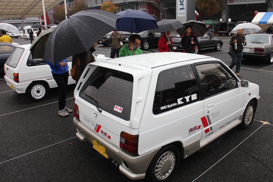 当日は生憎の雨の中での開催となった今年の80ミーティング。周囲には霧も立ちこめる富士スピードウェイでは、展示を中心とするミーティングのほか、大人気の40メートルを手押しで競う「ゼロヨンレース」なども開催された。