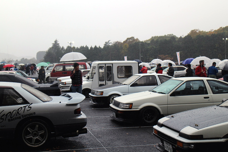 雨の中、会場の各所では、クルマ談義が尽きることはなかった。