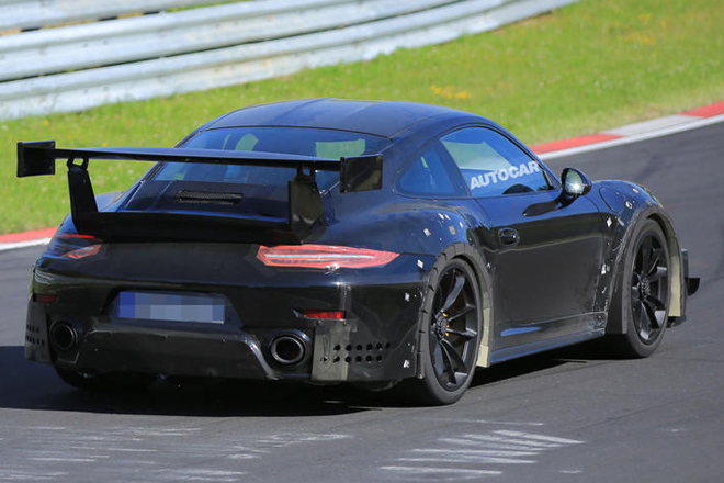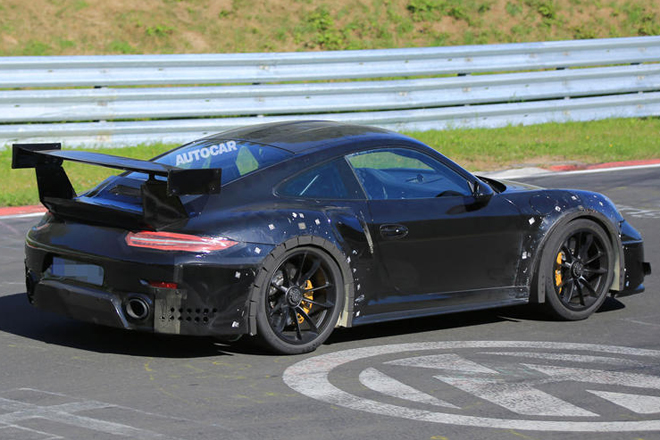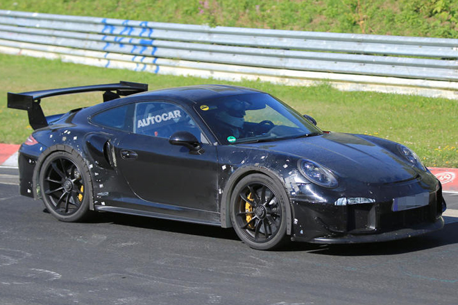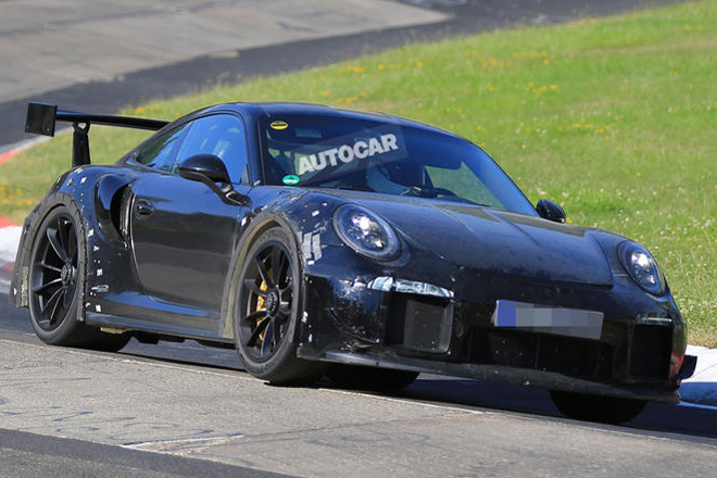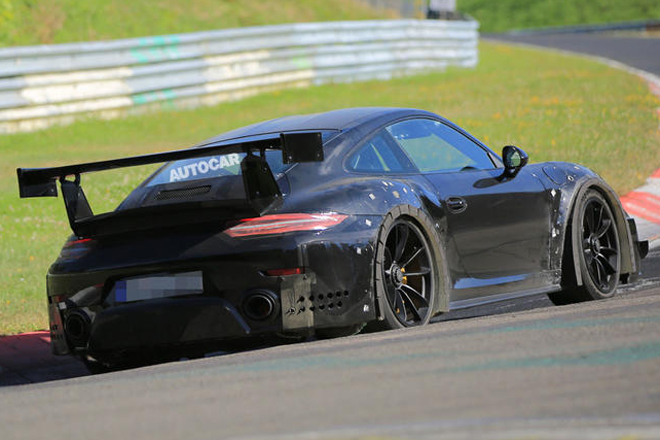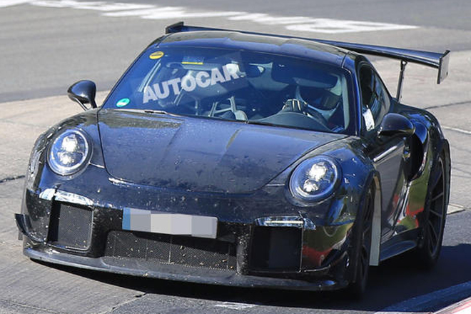 ポルシェ911GT2 RSがニュルブルクリンクでテストされているのが再び発見された。しかし、この911GT2 RSのテスト・モデルは、GT3 RSと同じホイールアーチ・ベントを持ったモデルのようである。どうやら911GT3 RSのボディの一部を拝借してのテストとも思える。しかし、より大きなリア・ウイングと、フロント・バンパーのレース・スタイルのウイングレットは専用のものである。