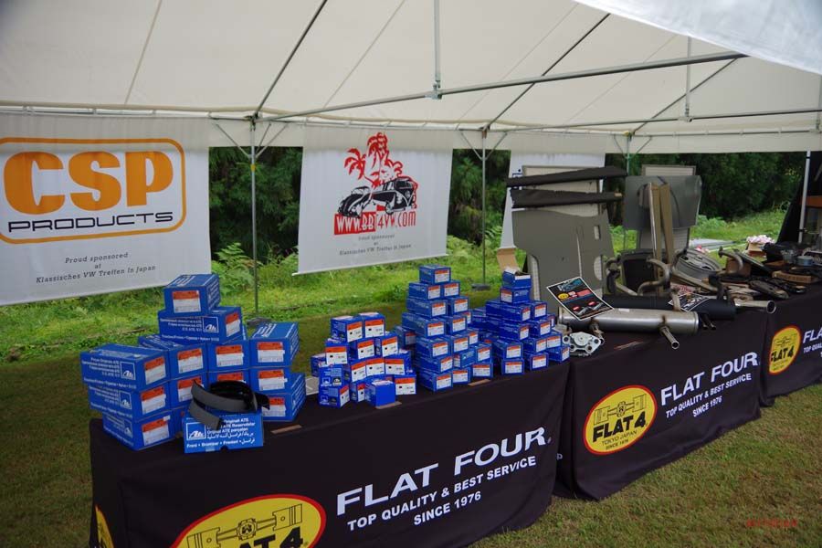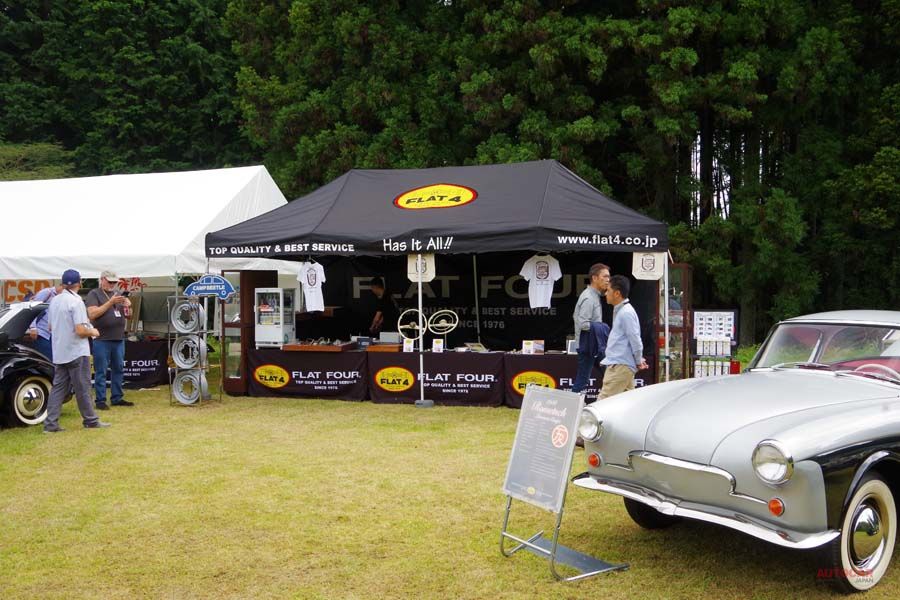 イベントを主催するFLAT4のブースでは記念アイテムの他にも様々なビンテージ空冷VW用のパーツを販売。コレクションカーも展示していた。
