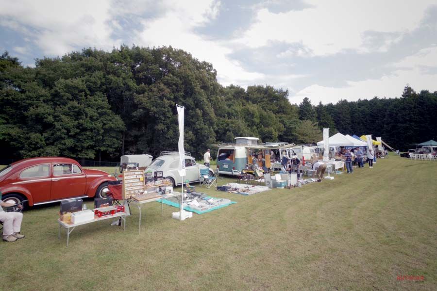 スペシャルショップから個人まで、様々なパーツやグッズが並ぶスワップミート。ショップのサポート車両もビンテージVWと徹底している。