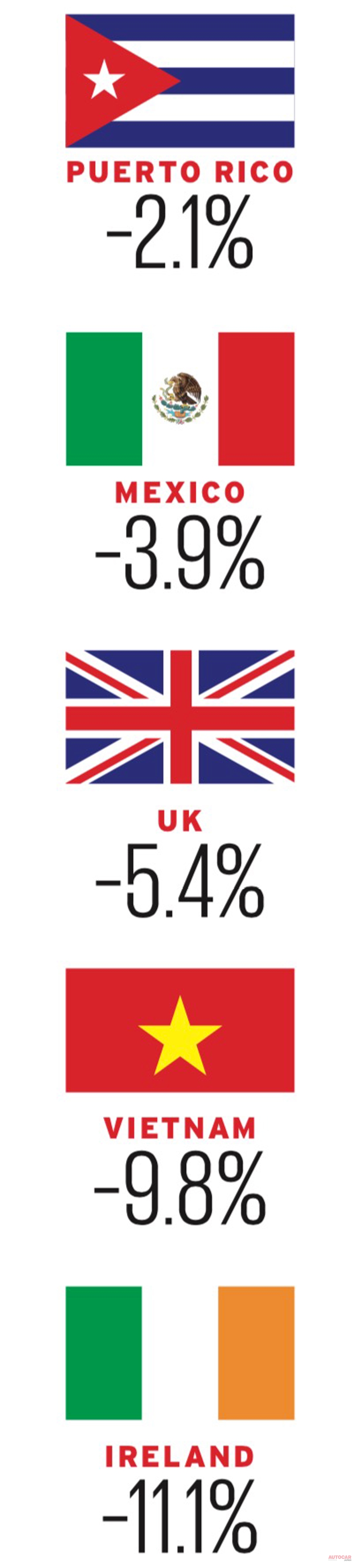 これがサッカーW杯の結果ならまるで悪夢だが、自国市場の販売落ち込みにより、英国の2017年は市場規模がより小さいメキシコやプエルトリコに続いて、対前年比で3番目に大きく販売数を減らした市場となった。アイルランドは、ブレグジットの余波と為替レートの影響をさらに急激に受けたことで、新車よりも輸入中古車の販売が増えた結果である。なお、米国市場も1.9%減となっている。