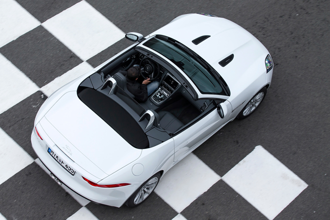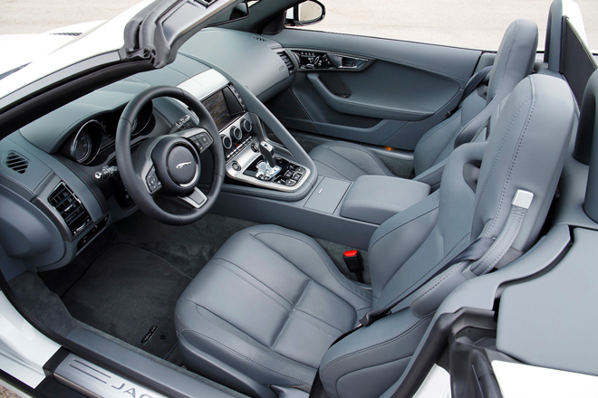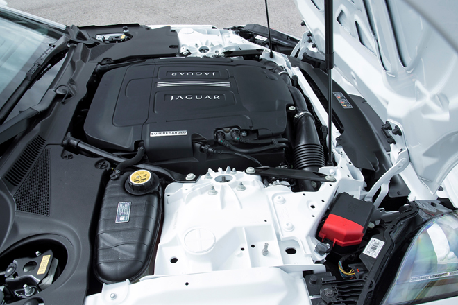 ジャガーF-タイプのエントリー・レベル・モデルがこのV6で、その価格は58,500ポンド(873万円)だ。しかし、エントリー・レベルといっても、必ずしもベーシックなクルマではない。というのも、エンジンは、336bhp/6500rpm、45.9kg-m/3500-5000rpmのパワー、トルクを発揮するスーパーチャージャー付きのV6エンジンで、これに高価なZF製の8速オートマティック・トランスミッションが組み合わせられたモデルであるからだ。