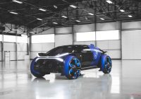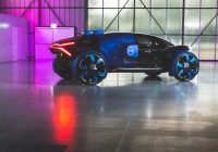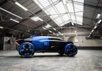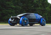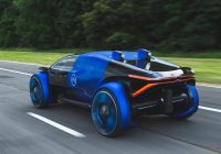 くさび形のキャビンが、サイクルフェンダーで覆われた巨大なタイヤの間に浮いている。他では見たことのないアピアランスだ。ボディは部分的に青と黒で塗り分けられ、細く断面が露出したような部分がヘッドライトとテールライト。ガラス製のフロントノーズは、フェンダーのラインに合わせてえぐられている。ルーフの中央後ろよりの部分からは謎の四角い物体がふたつ飛び出し、月面走行車のような雰囲気すらある。