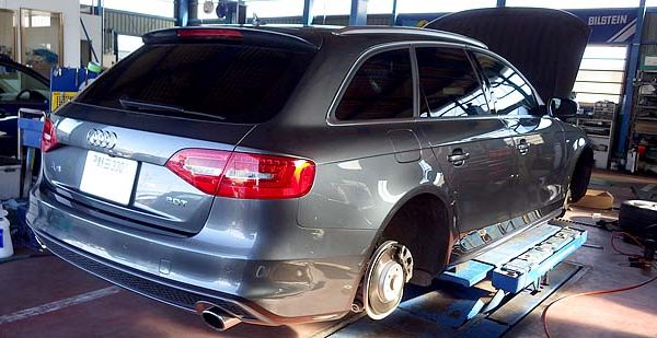 ザンフター ヴンドの白石です。 納車されたばかりというお客様のアウディA4アバント。まずはチョット気になる車高をKWの車高調...