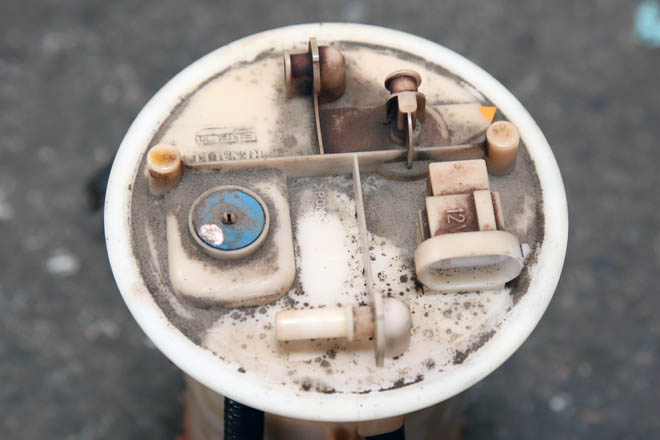 入庫時にガソリンが漏れるトラブルが発生。点検したところフューエルタンクに内蔵されているフューエルポンプの取り出し口とホースの接合部からの漏れでした。取り出し口の変形による漏れでしたので、フューエルポンプ・アッシィの交換で解決しました。